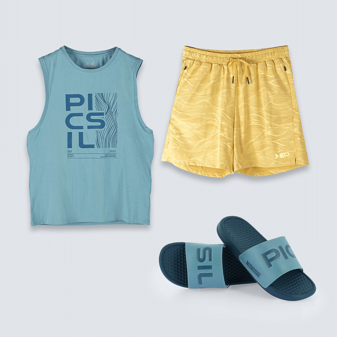 La maglietta dal taglio rilassato appartiene alla linea tecnica di Picsil, leggera e traspirante, ideale per mantenere la freschezza nei giorni caldi. Il costume da bagno incorpora una rete interna per un maggiore supporto, vita elastica con cordoncino regolabile e tasche laterali per un uso funzionale. Le infradito, realizzate in gomma resistente, assicurano una camminata comoda e sicura, completando un look pratico e attuale.
