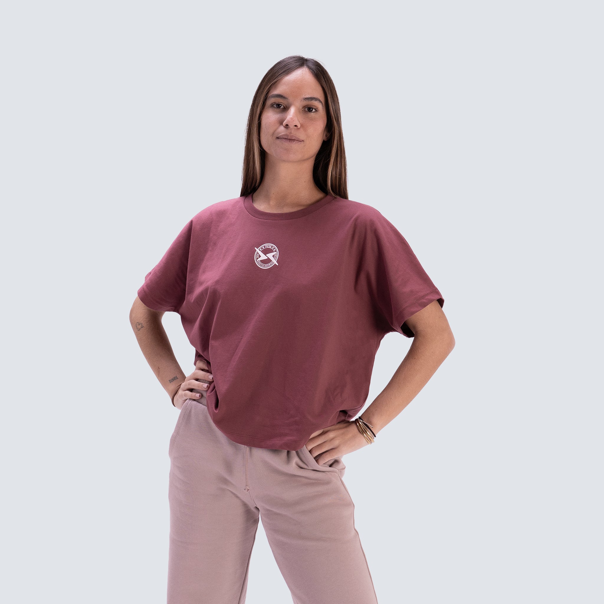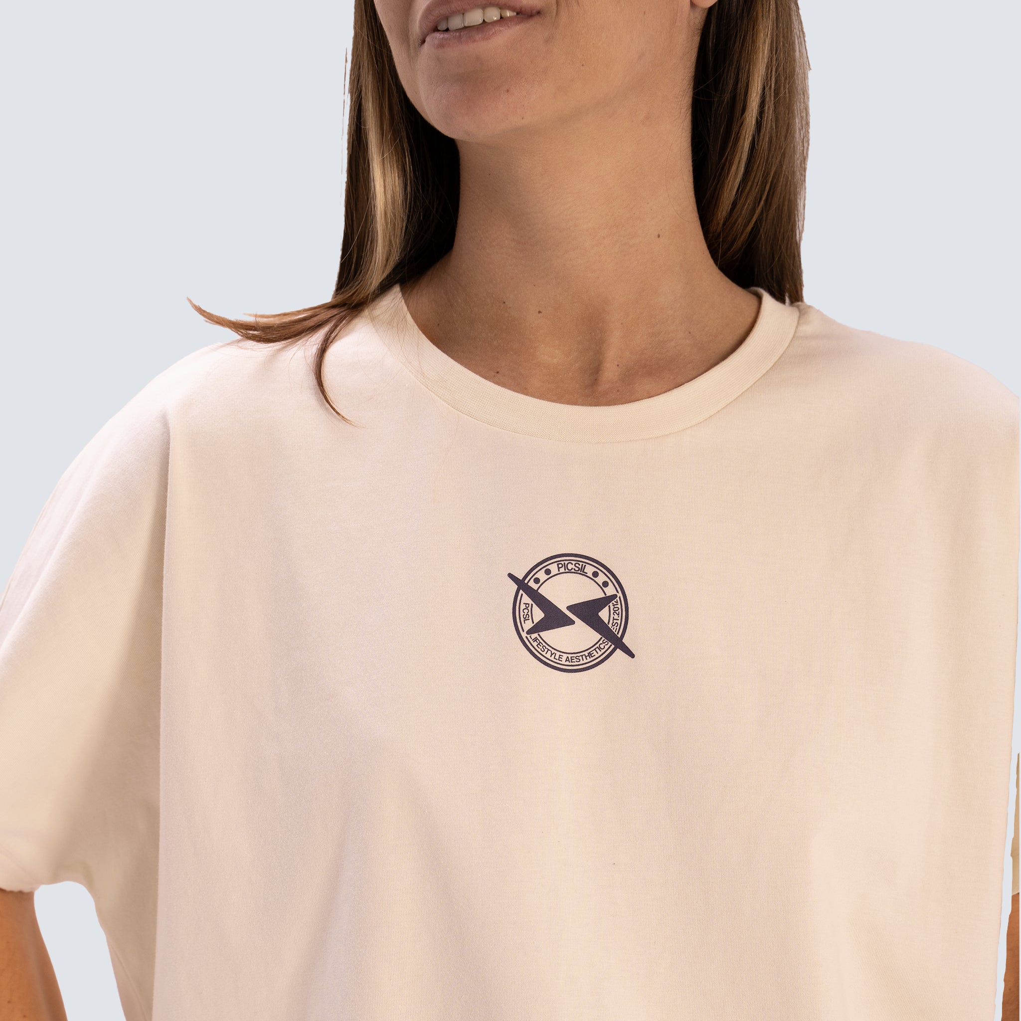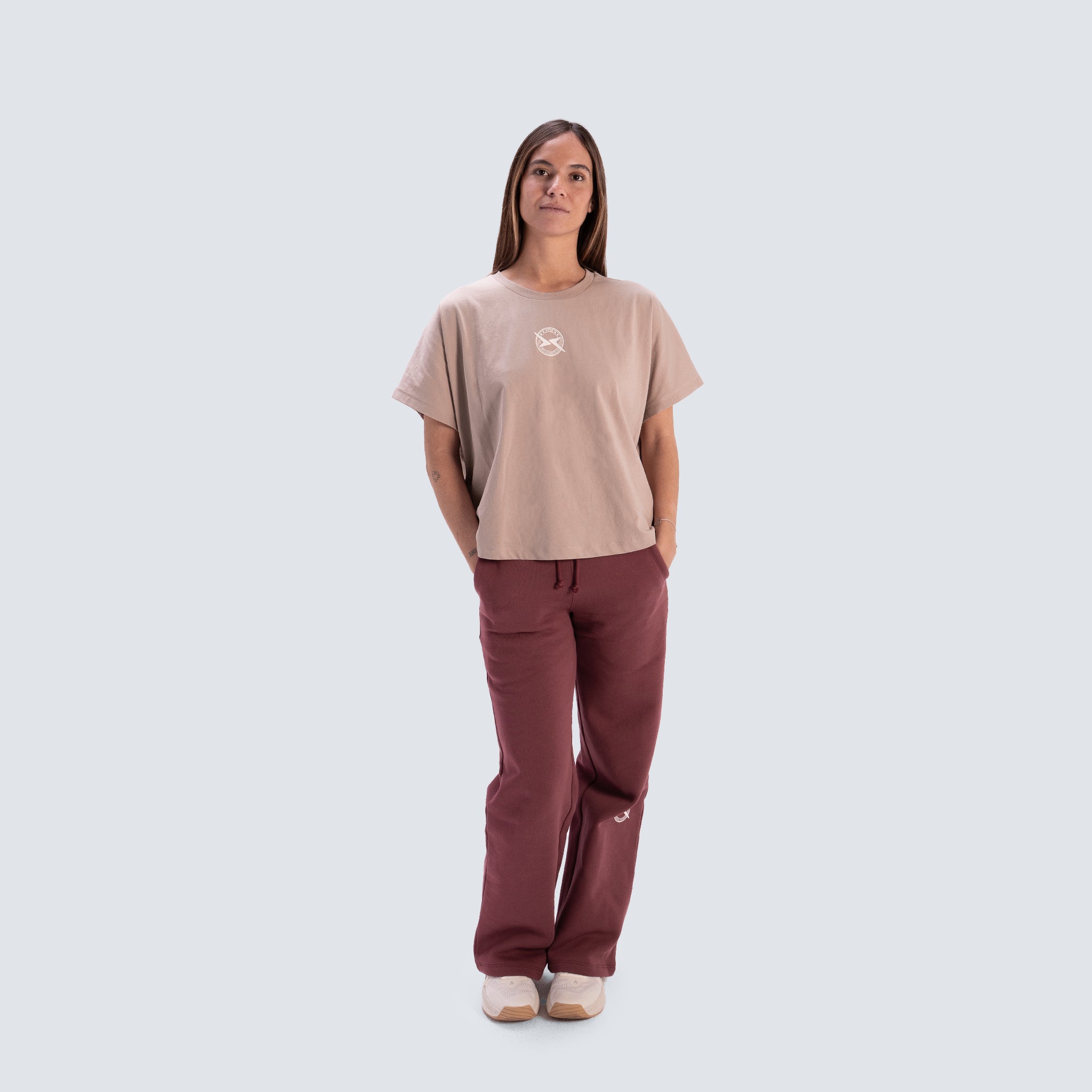 Maglietta cropped per donna progettata per un look pulito e attuale. Realizzata in 100% cotone organico portoghese, offre un tocco morbido e una buona traspirabilità, ideale per indossare quotidianamente o per i tuoi allenamenti. Il suo fit cropped oversize offre una caduta rilassata e si abbina molto bene con pantaloni a vita alta, jogger o flare.